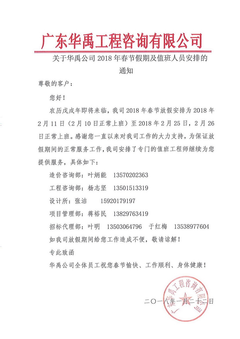 关于华禹公司2018年春节假期及值班人员安排的通知