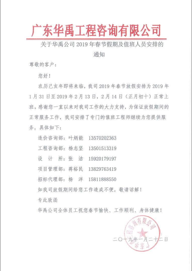 关于华禹公司2019年春节假期及值班人员安排的通知