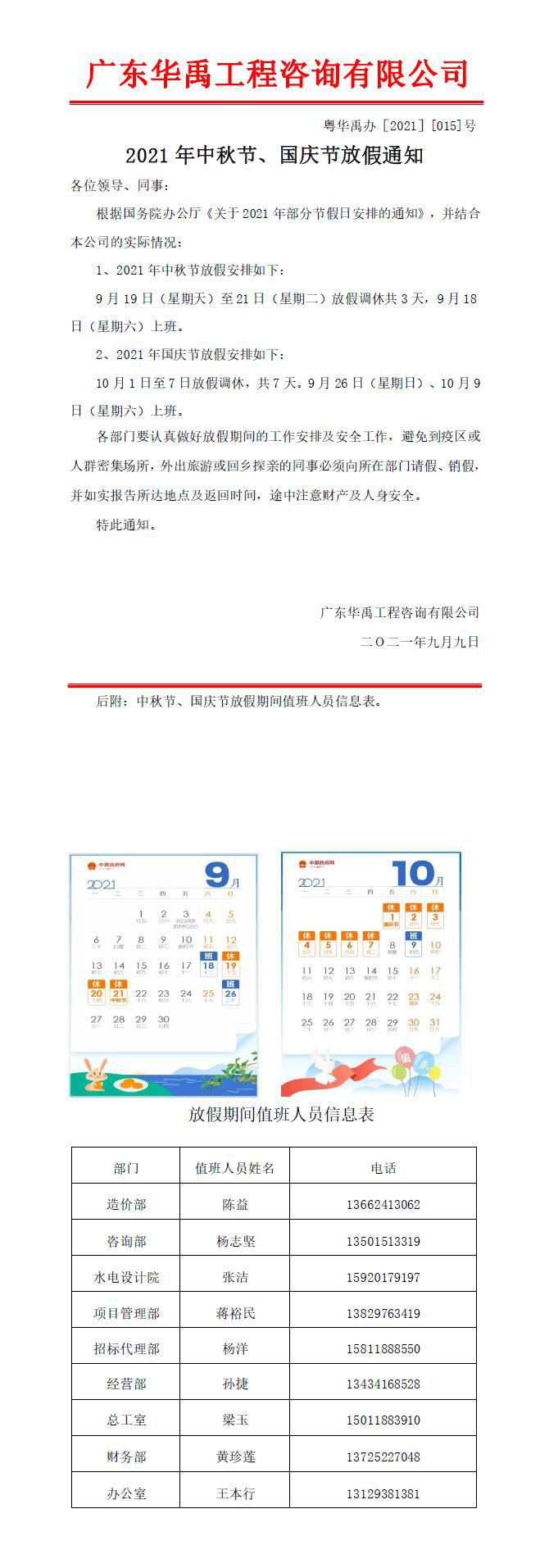 关于2021年中秋节、国庆节放假通知