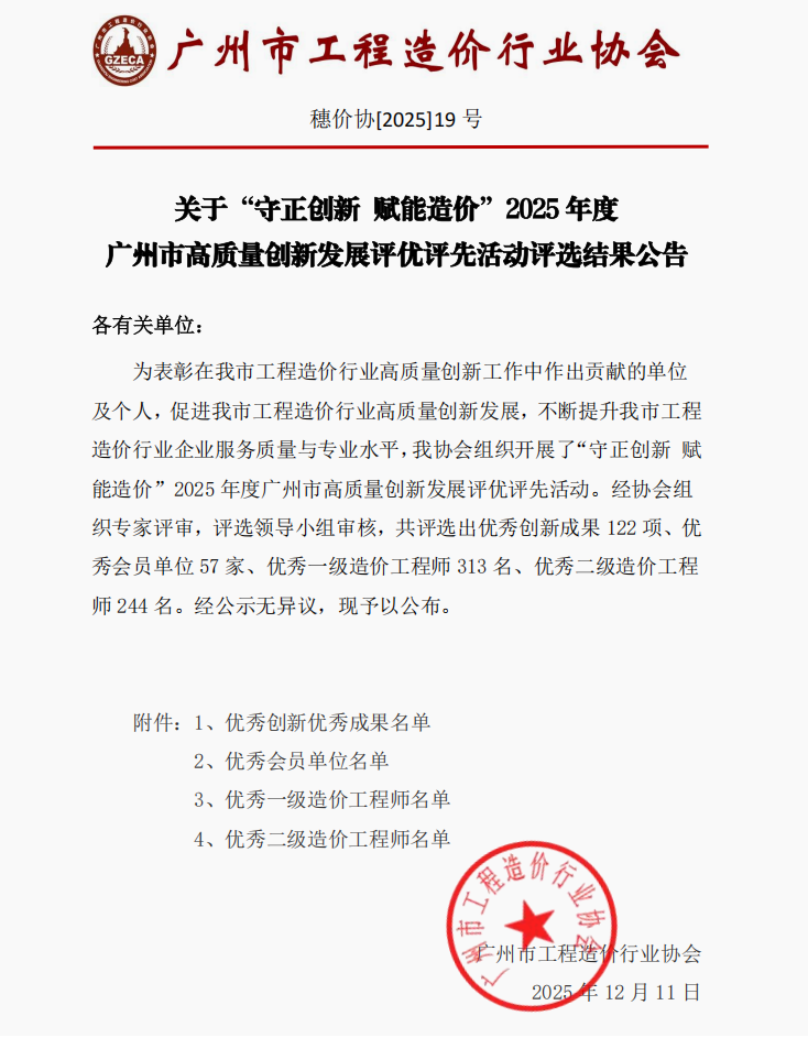 关于“守正创新 赋能造价”2025年度广州市高质量创新发展评优评先活动评选结果公告(穗价协[2025]19号)