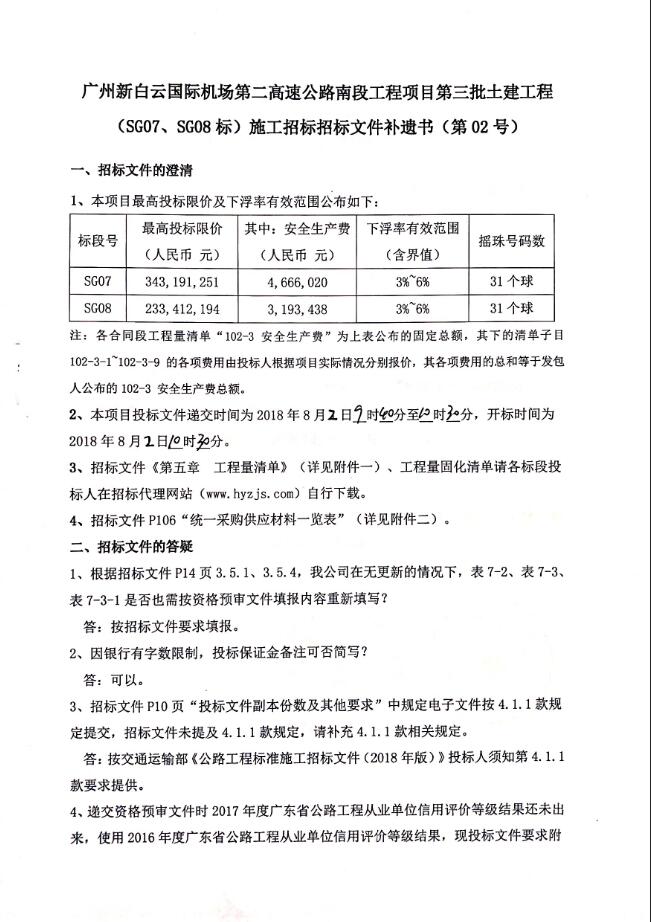 补遗书 - 广州新白云机场第二高速南段工程项目第三批土建工程(SG07、SG08标)施工招标招标文件补遗书(第02号)