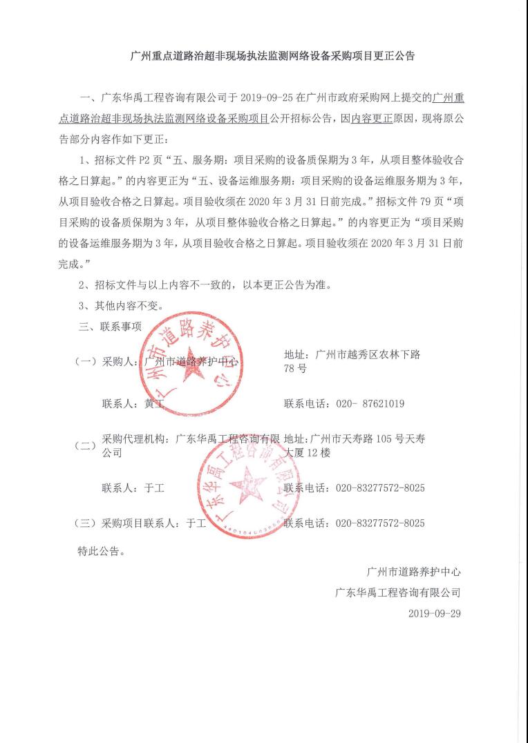 更正公告 - 广州重点道路治超非现场执法监测网络设备采购项目更正公告
