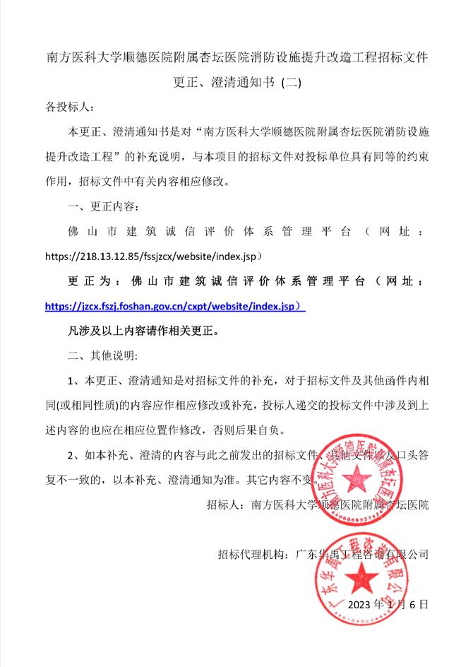招标文件更正、澄清通知书 - 南方医科大学顺德医院附属杏坛医院消防设施提升改造工程招标文件更正、澄清通知书 (二)