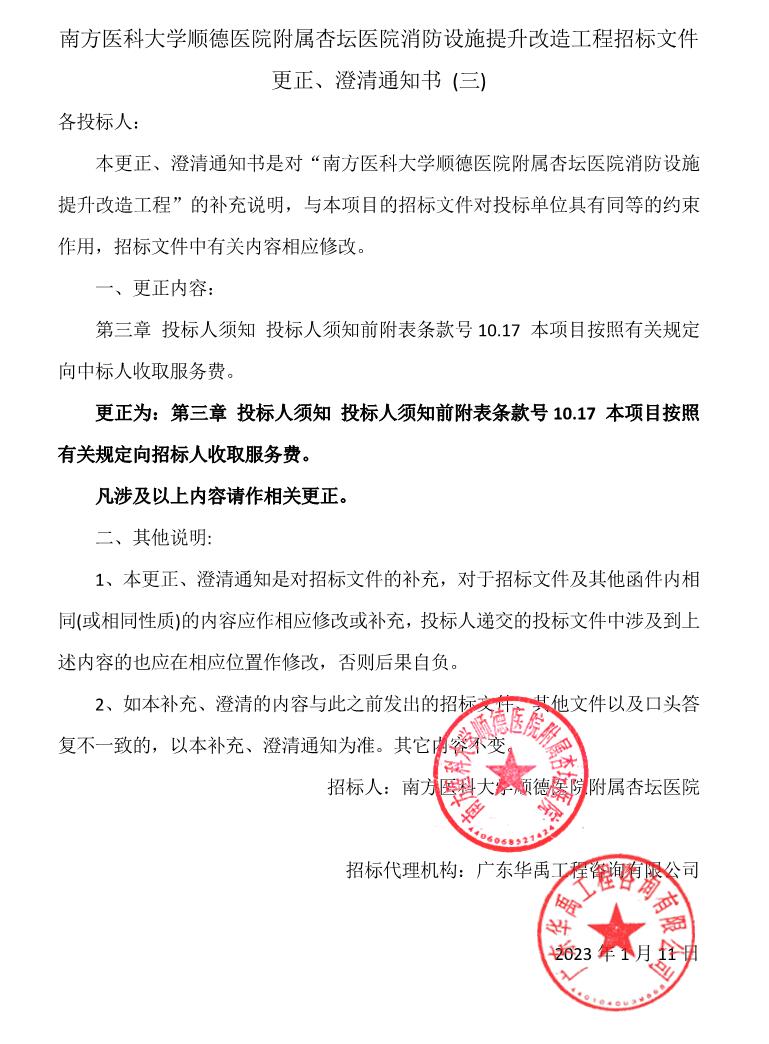 更正公告 - 南方医科大学顺德医院附属杏坛医院消防设施提升改造工程招标文件更正、澄清通知书 (三)