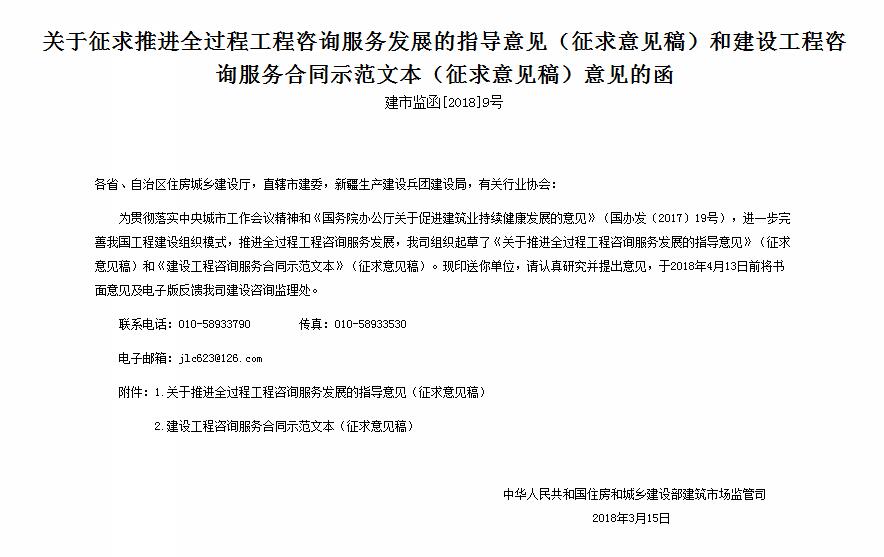关于征求推进全过程工程咨询服务发展的指导意见(征求意见稿)和建设工程咨询服务合同示范文本(征求意见稿)意见的函