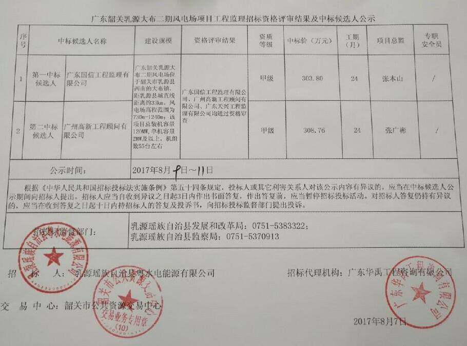 中标公告 - 广东韶关乳源大布二期风电场项目工程监理招标资格评审结果及中标候选人公示