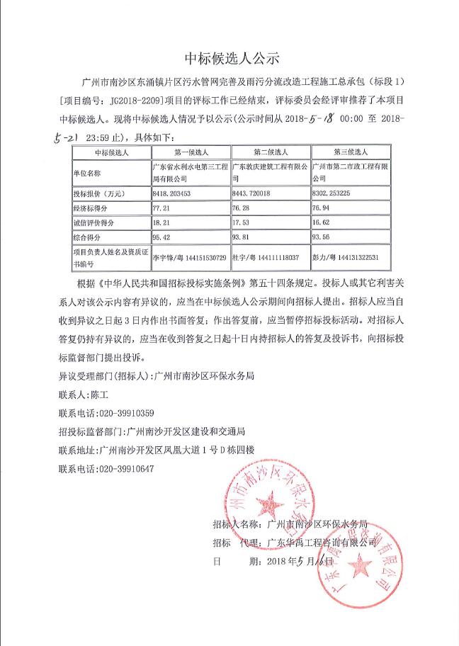 中标公告 - 广州市南沙区东涌镇片区污水管网完善及雨污分流改造工程施工总承包(标段1)